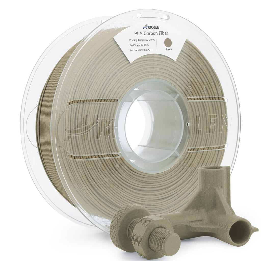 AMOLEN carbon fiber filament contains 15% premium carbon fiber and USA-imported materials. Compared to basic PLA, it is lighter, stiffer, has lower warp and shrinkage, and offers better layer adhesion. Ideal for complex applications like UAVs, aircraft model joints, and drives.