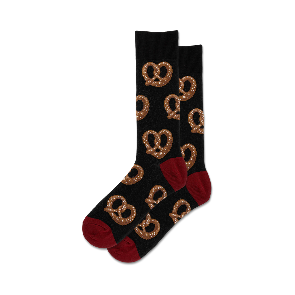 Add some twist to your daily ensemble with our Pretzel socks! These black crew socks pop with a bold red toe and heel, sprinkled liberally with a quirky pretzel pattern. Perfect for snacking aficionados or anyone who appreciates a pinch of fun in their wardrobe. Wearing these, you're guaranteed to make any munching occasion or casual meeting deliciously stylish. Who's ready to bring a little zest to their step with these snack-tastic socks?
