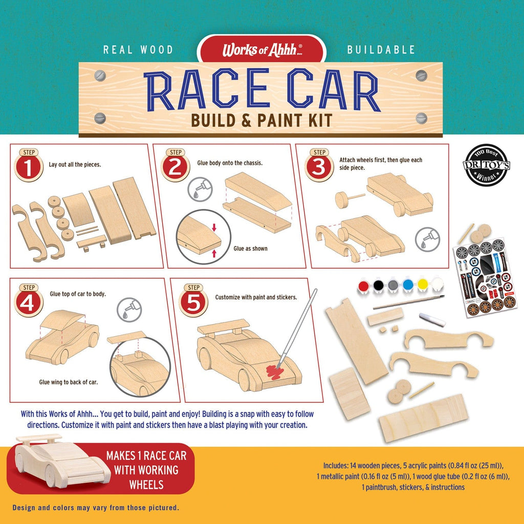 This Race Car Buildable Wood Craft & Paint Kit is made of real wood, and includes everything you need to create a beautiful work of art! The Race Car Buildable Wood Craft & Paint Kit is the perfect gift for every art loving kid! It includes 1 unassembled race car, 1 non-toxic metallic finish, 4 non-toxic acrylic paint tubs, 1 glue tube, 1 sticker sheet, 1 artist-quality paintbrush, and 1 instruction sheet with painting guide.
