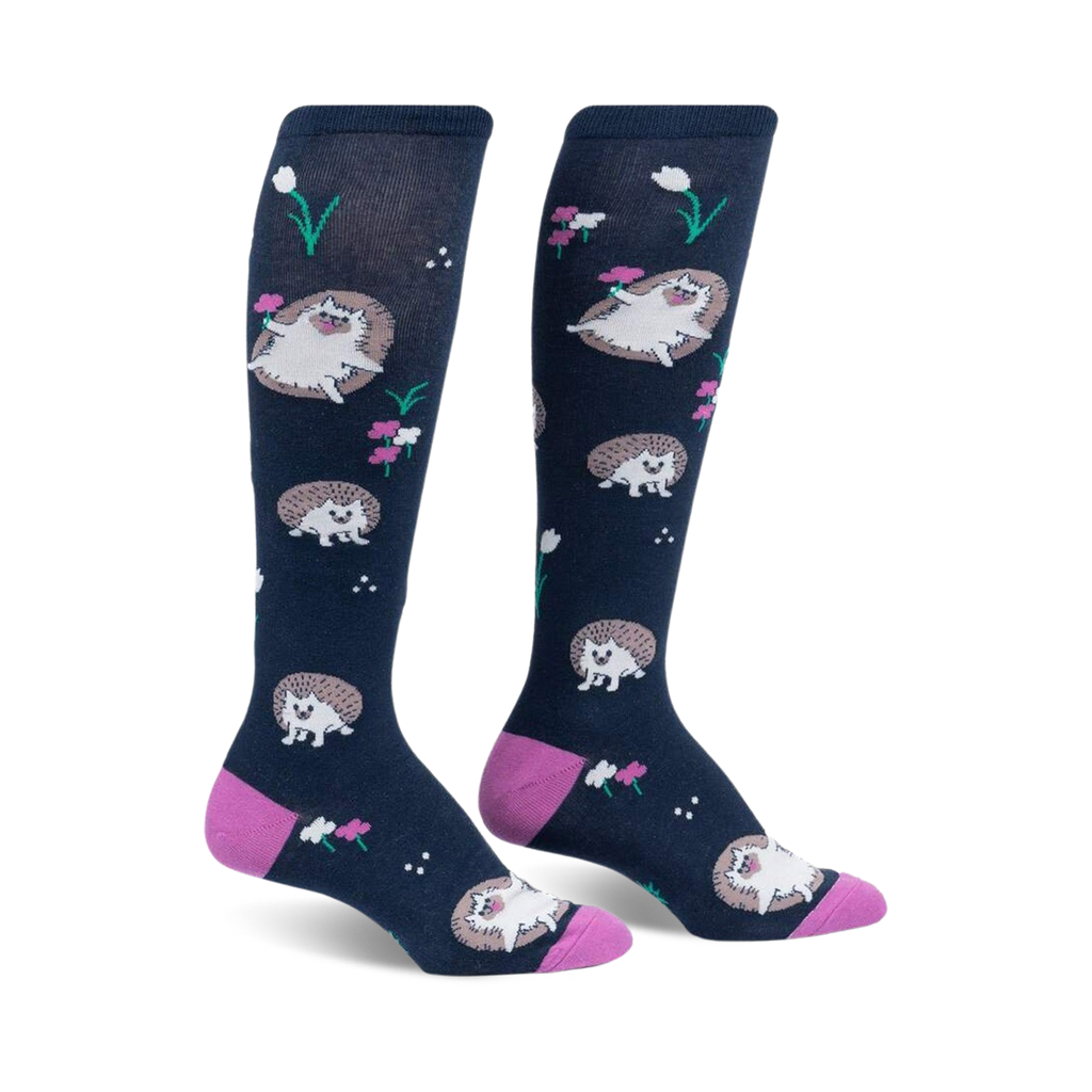 Rollin' with my Hedgehog socks, let your feet party! Strut your stuff with these knee-high, dark blue socks featuring a lively crew of hedgehogs. Celebrate the good times with hedgehogs in party hats & sunglasses, holding flowers. Pink toes & heels add an extra touch of fun. These socks are the perfect accessory for any wild night out or relaxed day in.