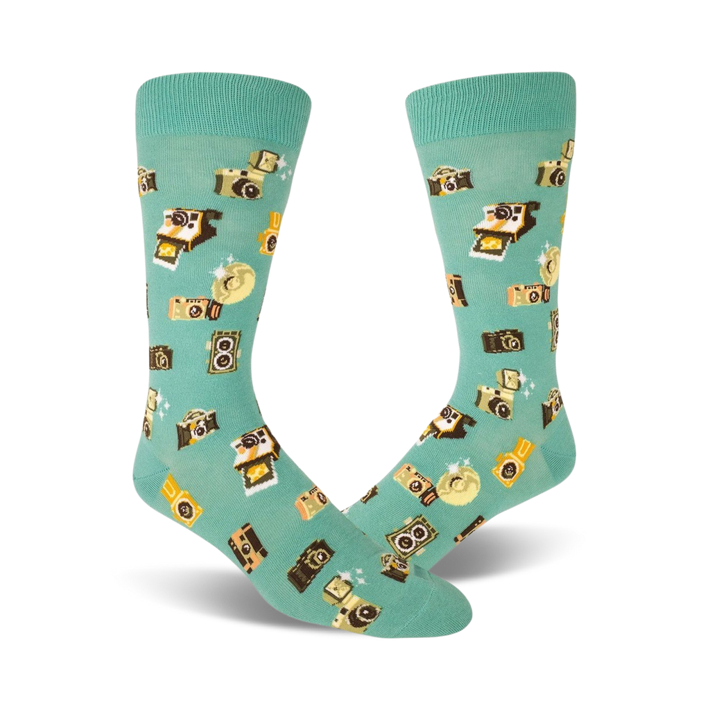Say Cheese! Let the vintage cameras on these mint green socks transport you to simpler times and create a vibrant backdrop for you to live out your dreams. These crew socks (made for men) are perfect for any photography enthusiast looking to spruce up their sock drawer. Remember, you don't have to be a pro to appreciate the art of a good photo; put your best foot forward with our Say Cheese socks.