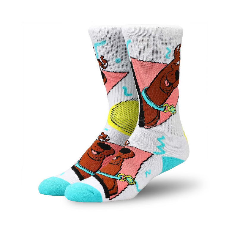 Zoinks! Get ready to solve mysteries in style with our Scooby Doo Retro Toss socks. These white crew socks are covered in a vibrant pink, blue, and yellow pattern of Scooby Doo in various poses. Perfect for the ultimate Scooby-Doo fan, these socks are sure to bring a smile to your face every time you wear them.