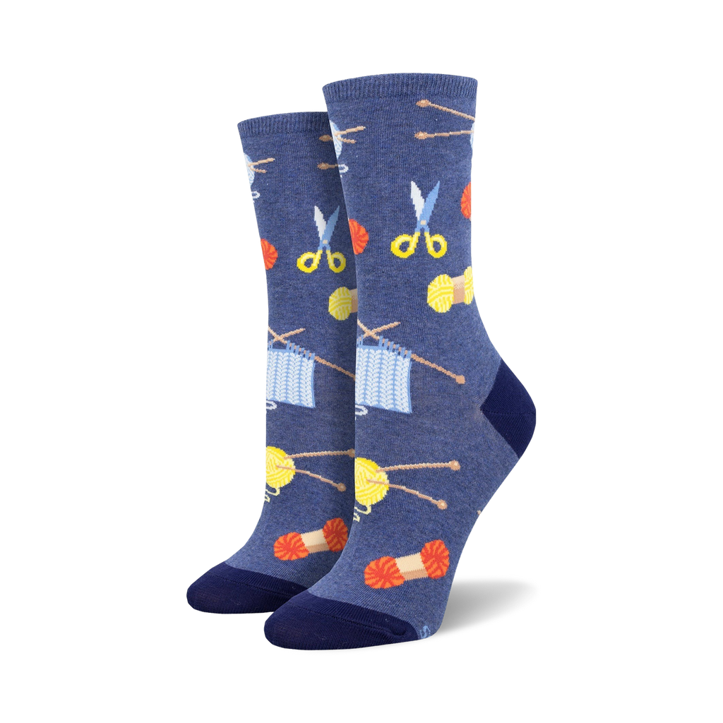 Show off your crafting passion with these Sew Knit socks! These crew length socks for women have a playful pattern of scissors, yarn, and knitting needles on a blue background, because you're never too far away from your next project. Always be prepared to talk about your love of knitting wherever you go!
