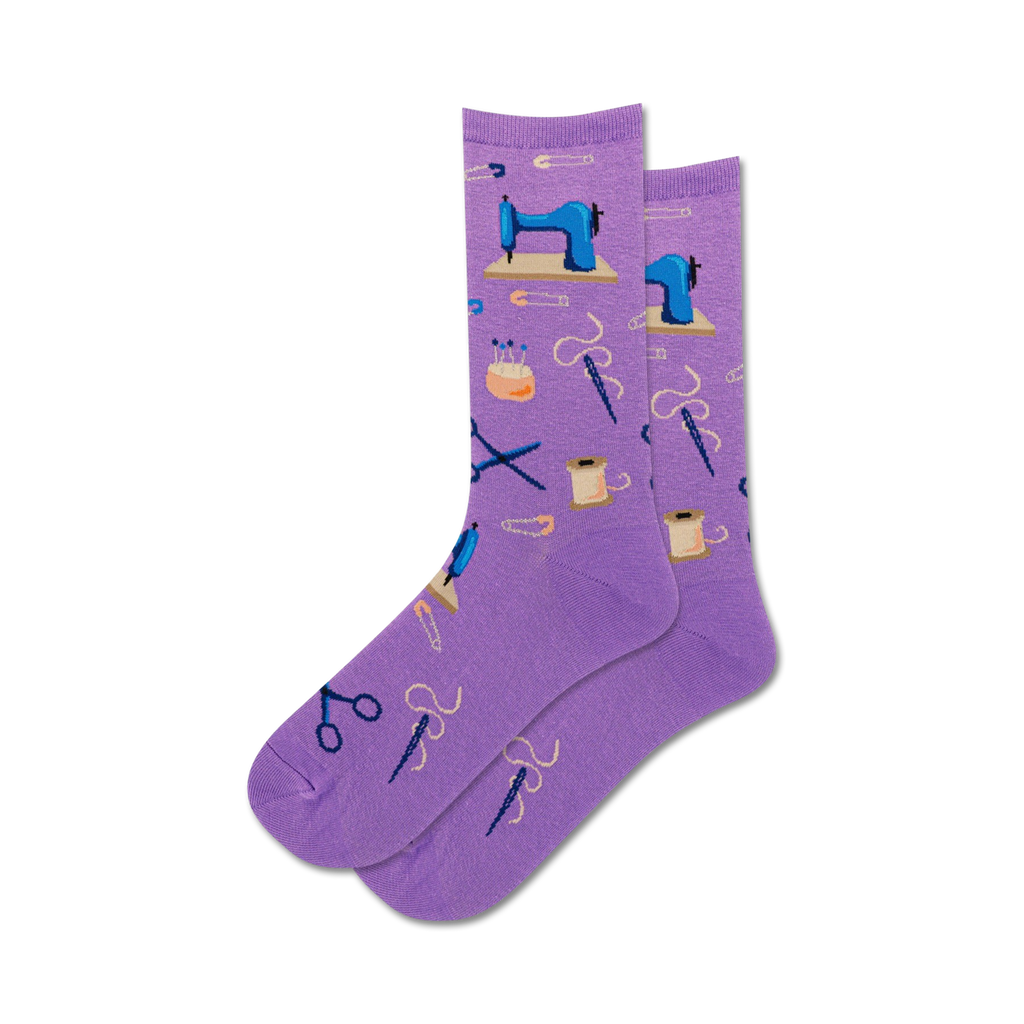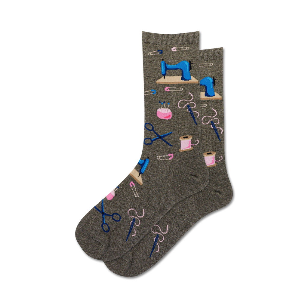 Put a little stitch in your style with our grey women's crew socks featuring a pattern of sewing supplies like scissors, spools of thread, and more. These clever socks make a fun and whimsical accessory for the crafty fashionista in your life.