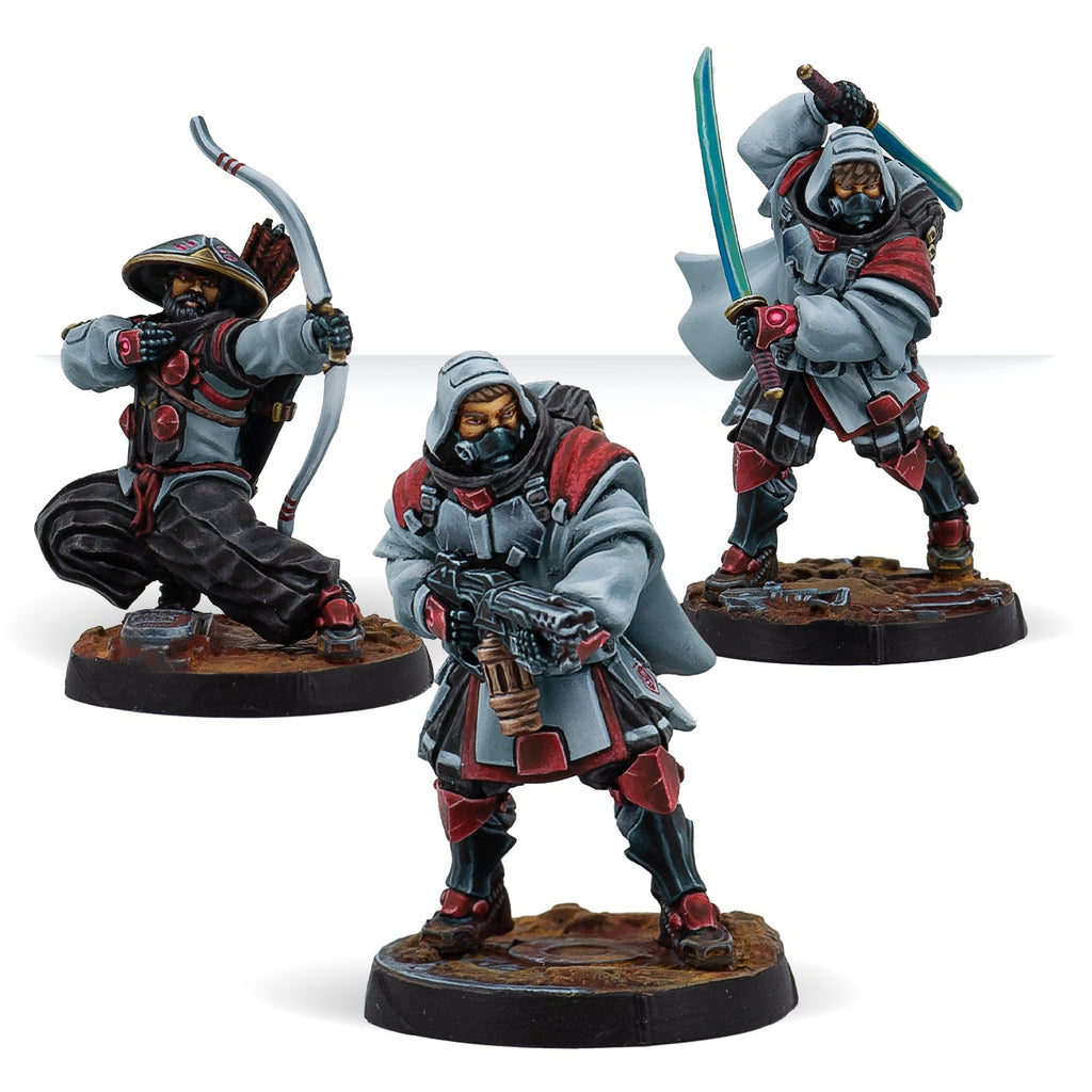 This box includes 3 miniatures from the Shindenbutai Sectorial Army of the JSA faction: 1 Kyojin Killer with Heavy Flamethrower, 1 Kyojin Killer with DA CCW, and 1 Yamabushi Paramedic with Tactical Bow. An excellent box to expand your Shindenbutai force collection