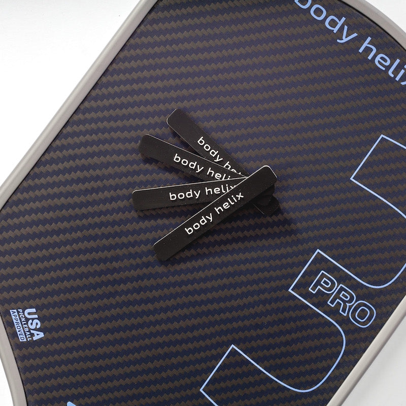 Customize your pickleball paddles with our lead-free paddle weights. Made from Silicone rubber. Soft and flexible. Designed to help you balance your paddle, while also acting as vibration dampeners. Embossed with body helix.