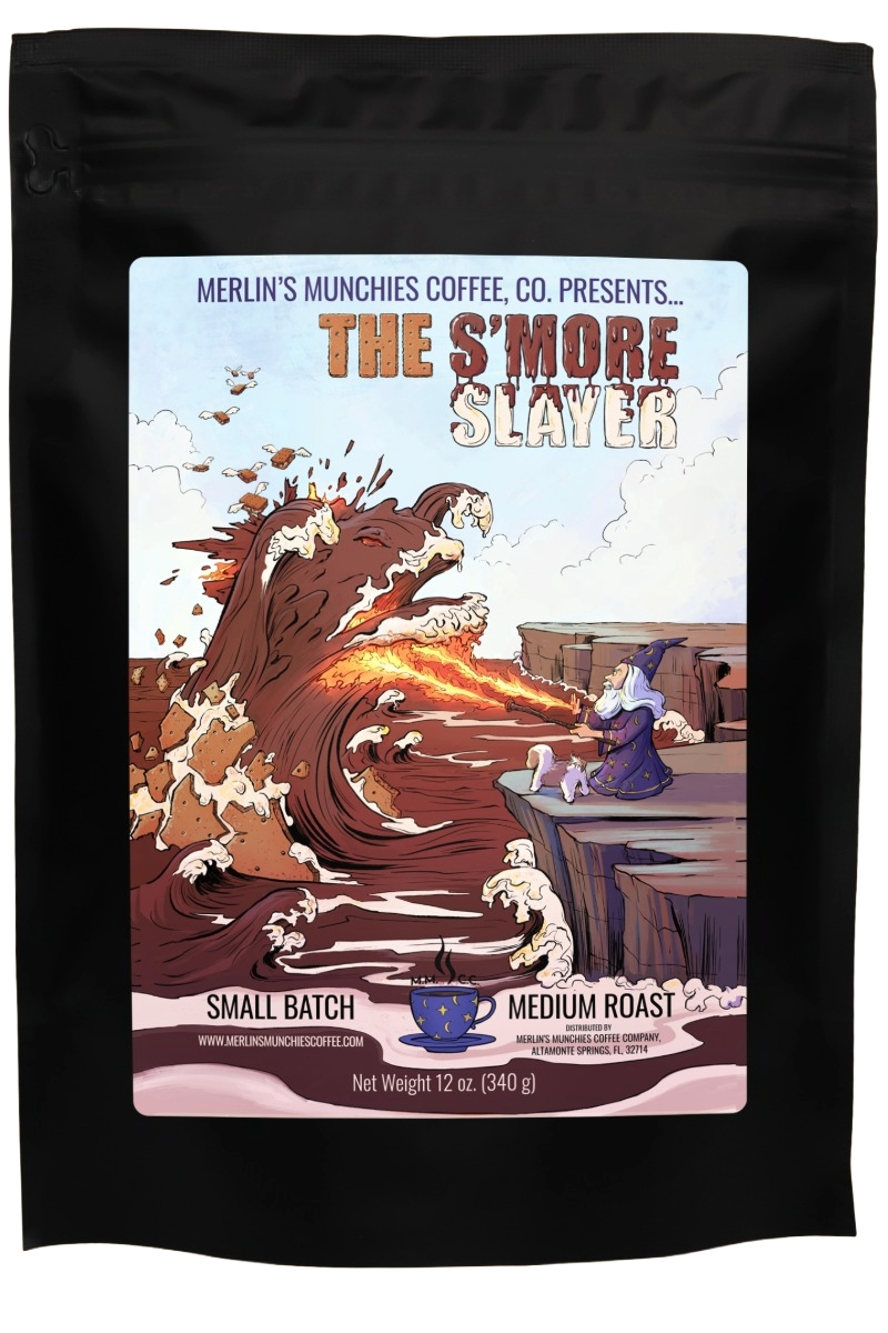 Merlin defeated the flavor-packed S'mores wave after an epic battle! He will now be forever known as the S'mores Slayer! Fortunately, they became friends and joined forces to make the best S'mores Coffee in the Multiverse! Enjoy our medium roast, Premium Colombian Supremo beans infused with chocolate, toasted marshmallows, and traces of graham cracker. This coffee's smooth finish will leave you craving more!