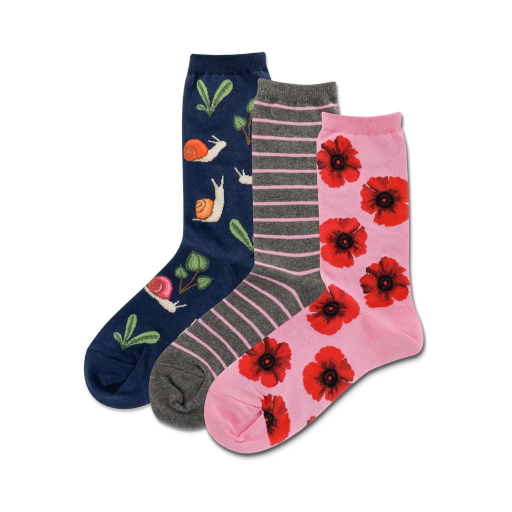 From the land of slow-paced and cool come these rad Snail socks. Who would have thought that such a sweet-moving creature could look so stylish on your feet? Whether you're out on the town or just snail-ing around the house, these socks will add a touch of whimsy to your day. These super fun crew socks in pink, gray, and blue show off a vibrant green leafy vine design with curious brown and blue snails and red & pink flowers. *Not approved for use as a snail costume.*