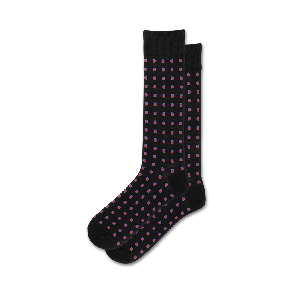 Split Dot socks, the most basic of basics. So basic they're exciting. These small purple and blue squares on a black background are perfect to complete any outfit, or just wear around the house. Basic can be fun too!