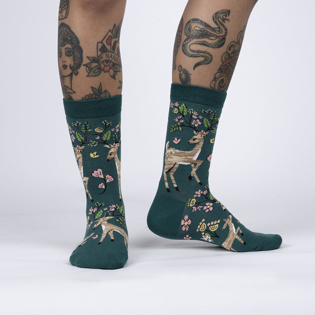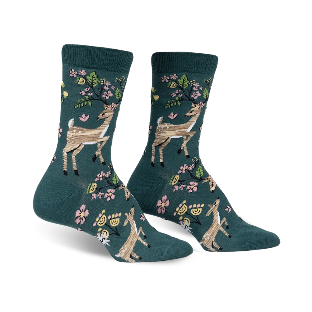 Spring Awakening novelty socks will let you walk on the wild side with these dark green kicks and their pattern of deer standing proud on their hind legs. You'll fawn over the pink flowers and green leaves growing from their antlers. With a pink toe and heel, these crew length socks for women are the perfect way to welcome the new season.