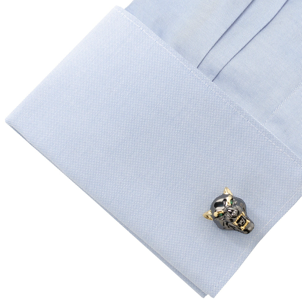 Expertly finished in black sterling silver with gold accents, these bold and daring cufflinks are sure to catch the eye. Designed in the visage of a black panther head with emerald green crystals for eyes, our 3D Black Panther Cufflinks will have you feeling fearless; the reverse side of the swivel closure features the word "FEAR." The expert craftsmanship of our Sterling Silver cufflinks ensures long-lasting durability and a classic look that is sure to never go out of style.