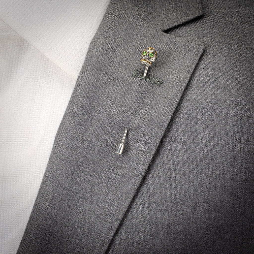Expertly finished in sterling silver with gold accents and green jewels, adorn your jacket with this stick pin featuring a 3D Day of the Dead skull fixture at the top. Stick pins, like lapel pins, add sophistication and character. The expert craftsmanship of our Sterling Silver stick pins ensures long-lasting durability and a classic look that is sure to never go out of style. Comes in an Ox & Bull cylinder tube.