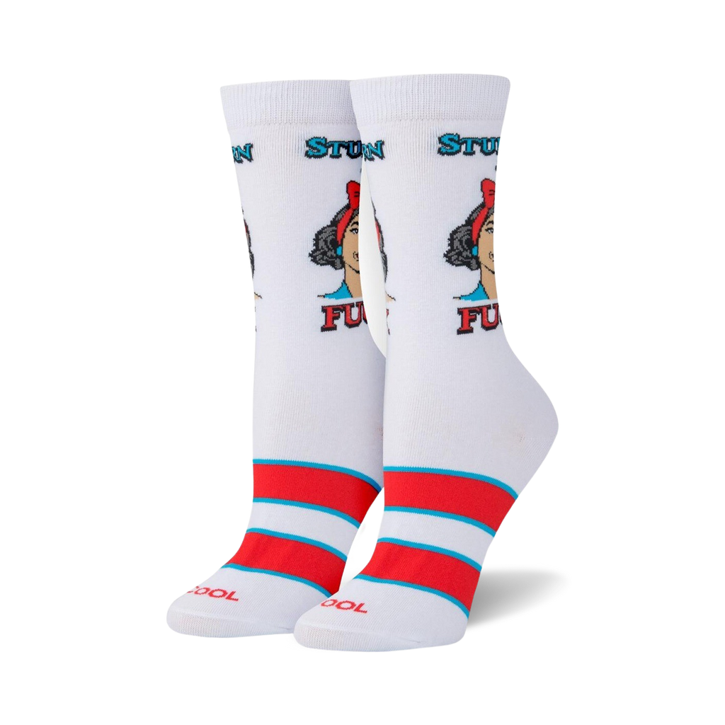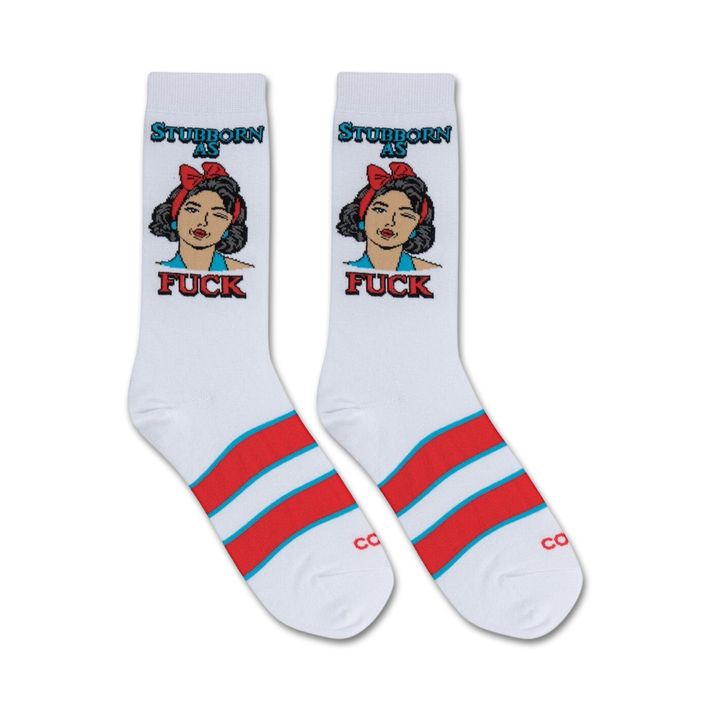 Stubborn women rule the world. Show off your unwavering stubbornness with these "Stubborn AF" socks with a fun repeating pattern of a headstrong, red headband-wearing woman winking at you. The word "fuck" is boldly written below her in black letters. The crew socks have red and white striped cuffs. Strut around and remind everyone that sometimes being stubborn is the best policy.