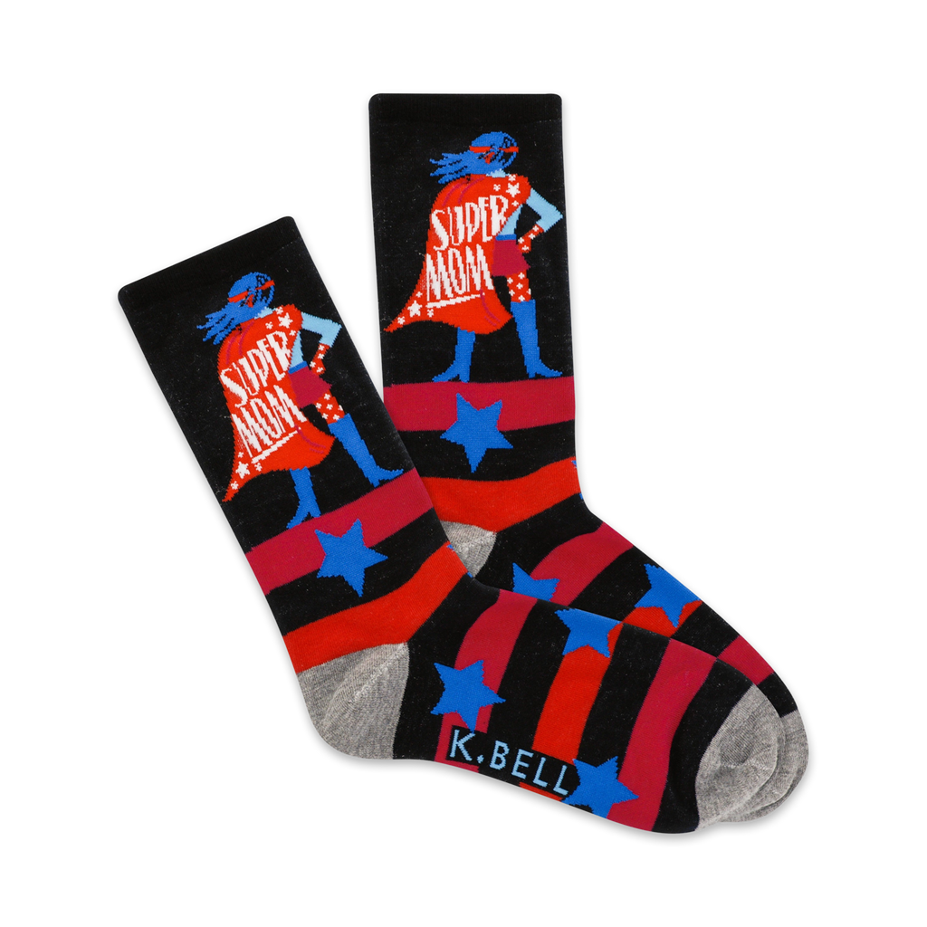 Calling all super moms! Gear up for Mother's Day with these eye-catching crew socks that scream "Super Mom" in bold red, white and blue stripes. Prepare to dazzle every room you walk into with your feet first. Your feet deserve a heroic pair of socks that empower them with each step.