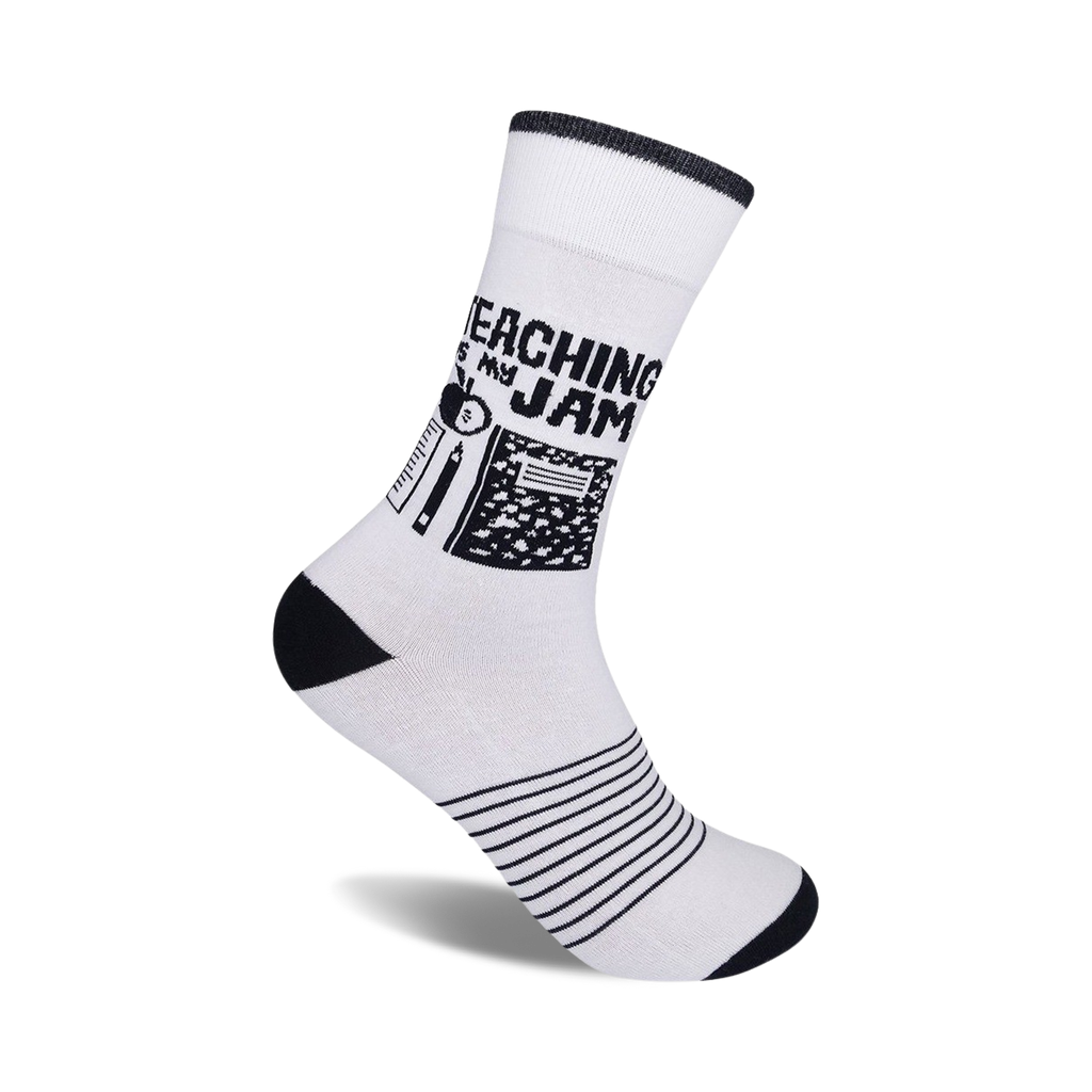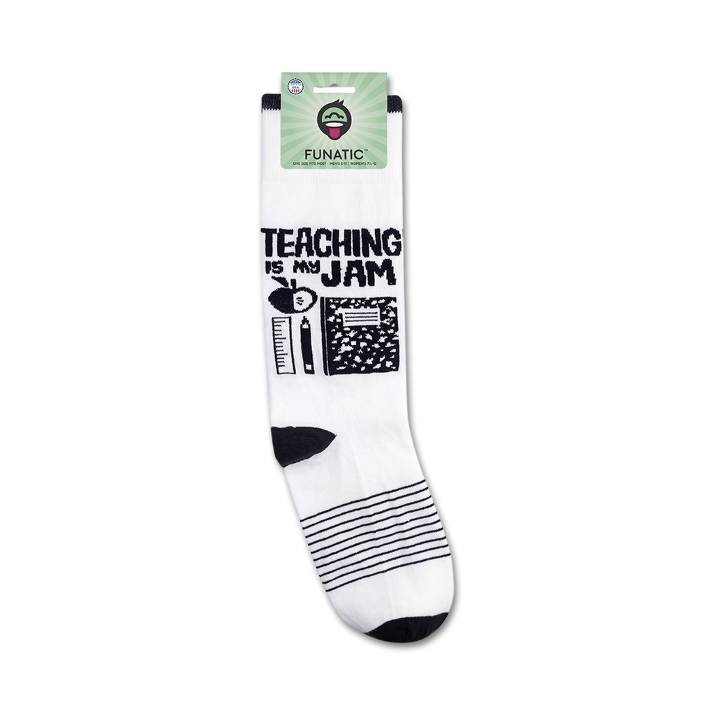 Take a break from dry, boring socks and slip into a pair of Teaching is My Jam socks! The bright white socks, splashed with black and red, feature the phrase "Teaching is My Jam" alongside an image of a ruler and a notebook, making them the perfect way to let your love of teaching shine through. Whether you're a seasoned professor or a just-starting-out teacher, these fun crew socks are the perfect way to show your dedication to the noble profession of teaching. And who knows? These socks might even make your students pay more attention in class!