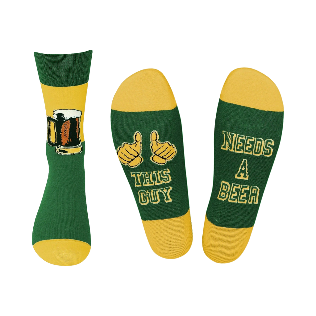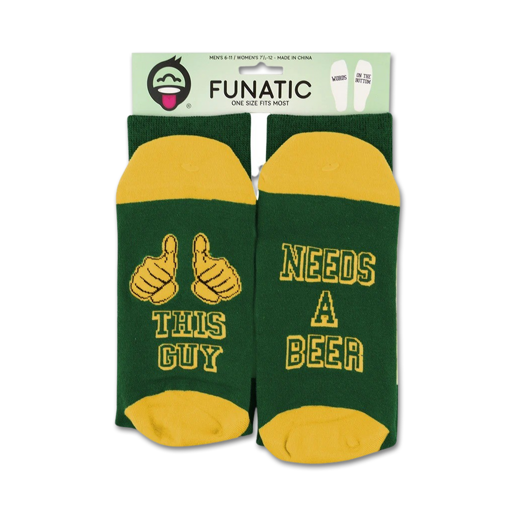 Beer me! Slip into the This Guy Needs A Beer novelty crew socks and quench your thirst for fun. With a frothy beer stein on one side and the cheeky message "This Guy Needs A Beer" on the other, these socks will have you and your drinking buddies toasting to good times. And when you're shoe-less and kicking back at home, the "thumbs up" graphic on the bottom of the socks will let everyone know you're the life of the party. Grab a cold one and raise a glass to these hoppy kicks!