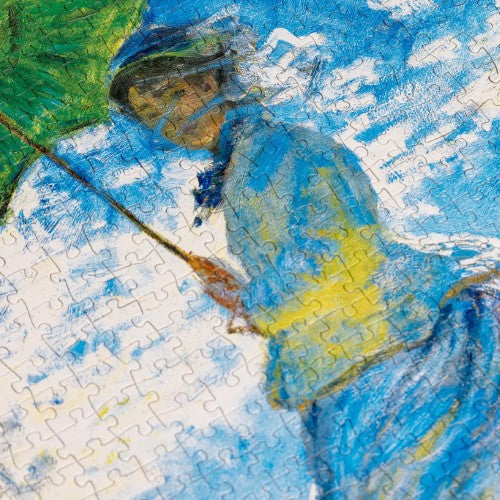 In Woman with a Parasol – Madame Monet and Her Son (1875), Claude Monet demonstrates that he is as talented a figure portraitist as a landscape artist. He captures his wife and son in an unexpected moment while walking on a windy summer’s day. Sunlight shines upon her back, while shades of yellow from the flowers below dapple her front. His signature light and spontaneous brushwork create splashes of color across the canvas: the green of the meadow is reflected in the underside of her parasol; the billowing clouds and swirling skirt of Madame Monet provide a sense of movement against the static figure of Jean, his son, set in background for depth.