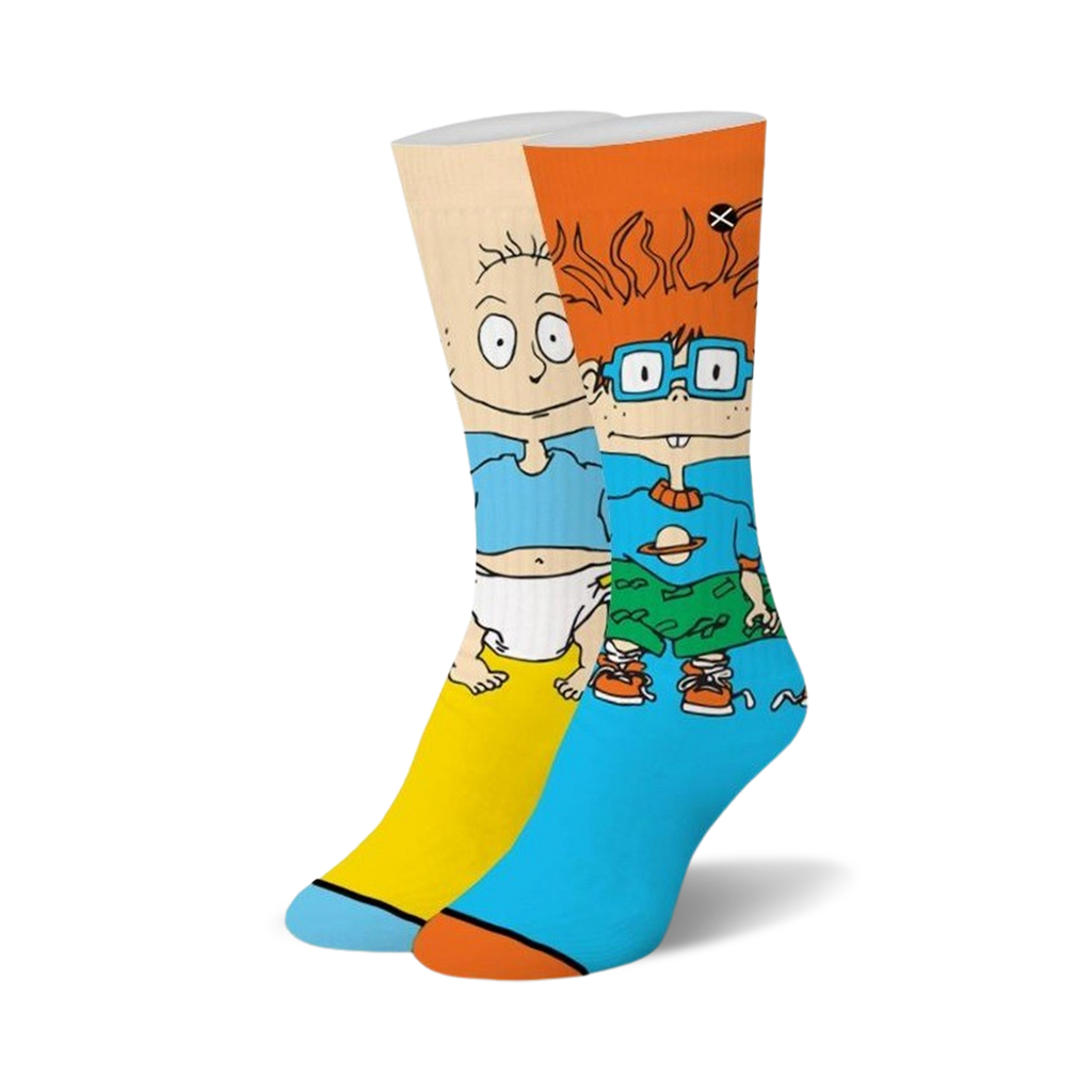 "Add some Rugrats charm to your sock collection with these crew-length beauties! The Tommy and Chuckie 360 Knit Socks feature an adorable allover print of the iconic cartoon duo. Chuckie's rocking his signature red hair, glasses, and diaper on the right sock, while Tommy brings the giggles with his blonde cowlick and diaper on the left. Get ready to make your feet the stars of the show!"