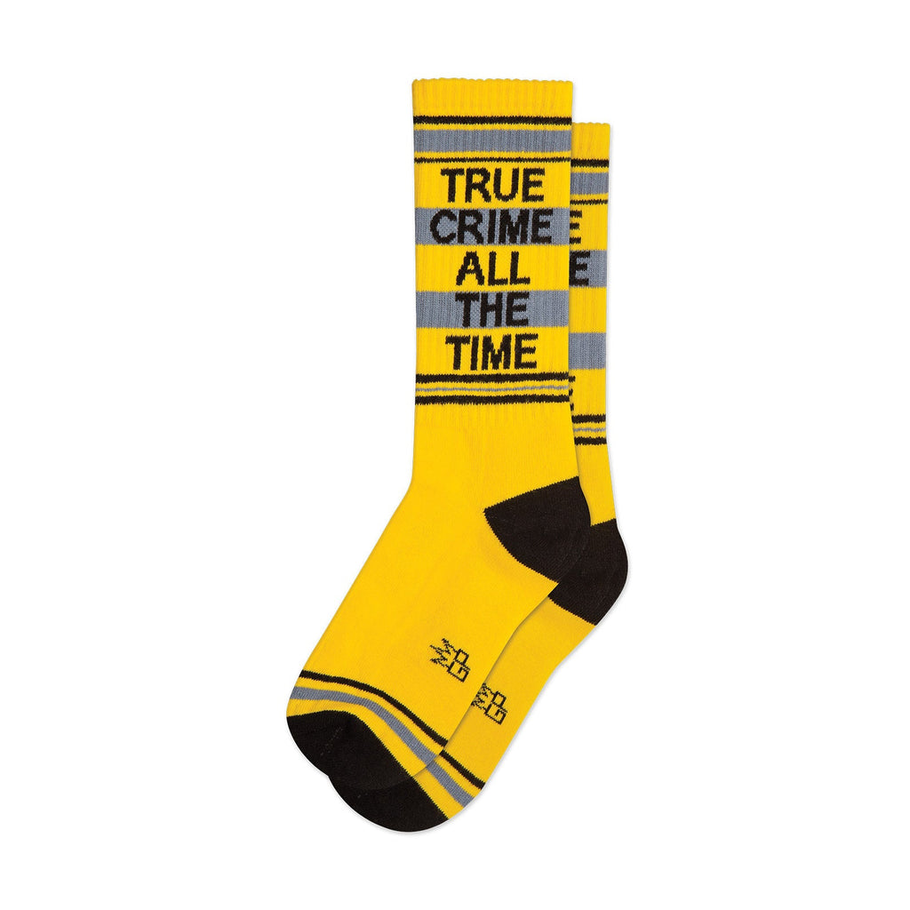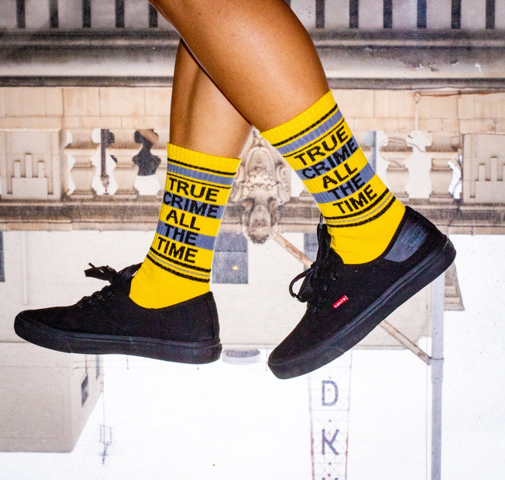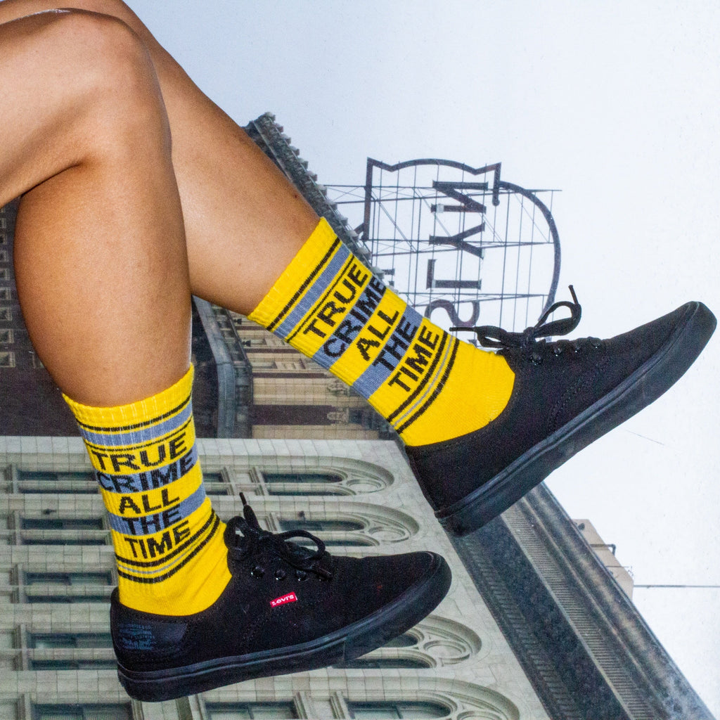 These aren't your grandma's argyle. They're 'True Crime All The Time' socks- and they're seriously awesome. Bright yellow is the base color, with grey stripes and the phrase 'TRUE CRIME ALL THE TIME' repeated vertically in a bold, black sans-serif font. The visible portion shows a crew sock length. The cuff and toe area are black. They're the perfect accessory for anyone who appreciates a good mystery- even if that mystery is just what you're having for dinner.