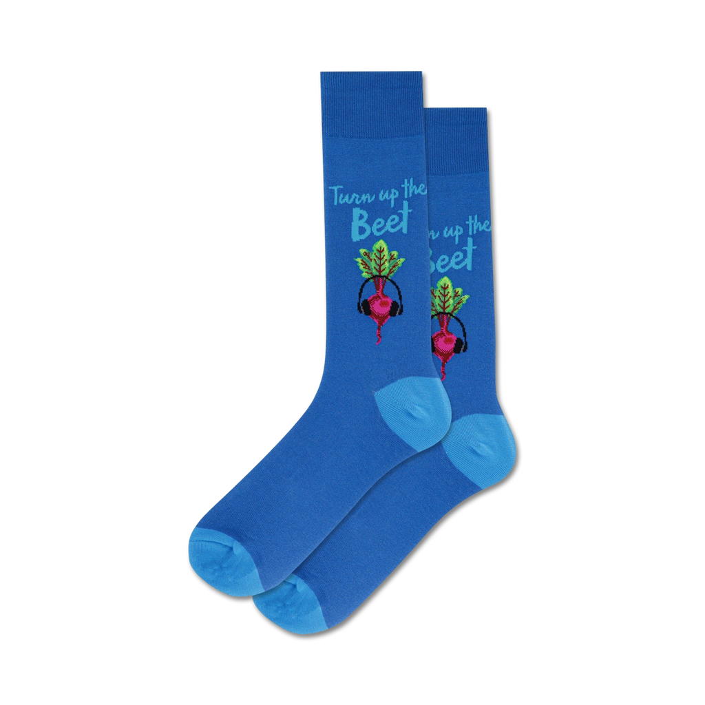 Who said veggies couldn't be musical? Slip into a pair of these cool 'Turn Up The Beet' socks, showing off a rad pattern of groovy red beets wearing headphones, reminding you that even roots can rock out.