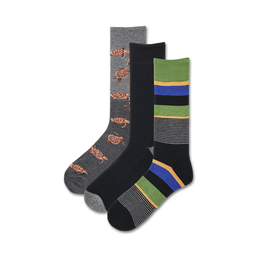 Everyone loves turtles, and these socks are no exception! With three pairs of turtle-rific socks, you'll never have to choose between your favorites again. From small and subtle to big and bold, these socks are the perfect way to show off your love for these shelled friends. With a blend of gray, black, brown, green, blue, and yellow, you'll make a splash wherever you go. Shell yeah!