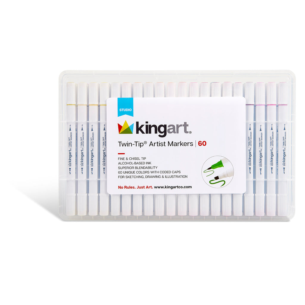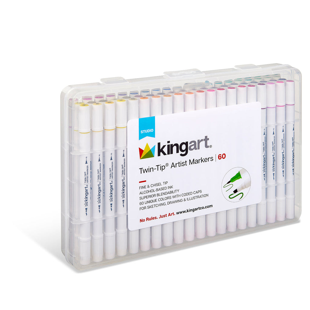 KINGART® Studio Twin-Tip™ Permanent Alcohol-Based Sketch Markers, Storage/Travel Case, Set of 60 Unique Colors, Perfect for Illustration Adult Coloring Sketching and Card Making