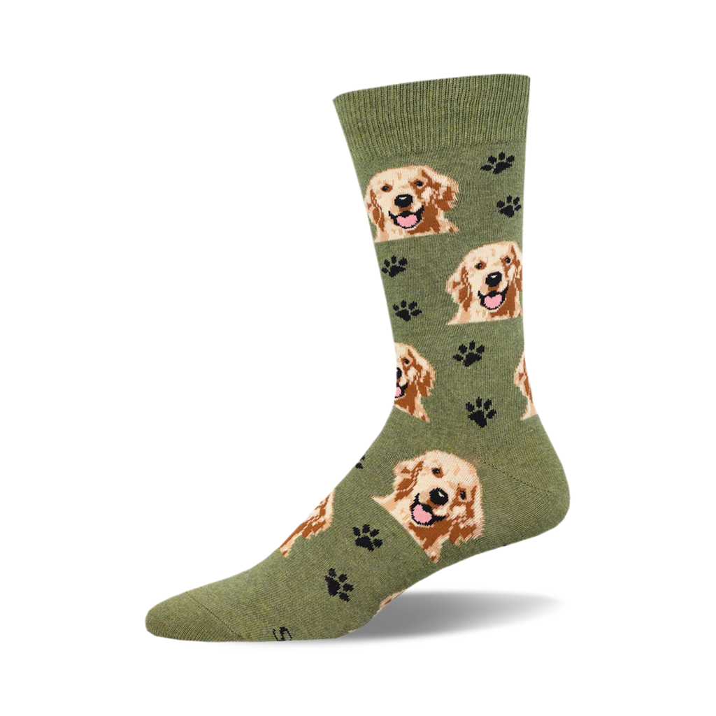Show some love for the 'goodest boys' with these comfortable olive green crew socks. They're covered in a happy pattern of Golden Retriever faces, each one looking cheerful with a little pink tongue peeking out. Black paw prints are scattered all over the visible parts of the sock, as if your best buddy just walked by. These socks offer a simple, laid-back way to celebrate your favorite furry friends. A great pick for dog lovers and anyone who appreciates easygoing style.