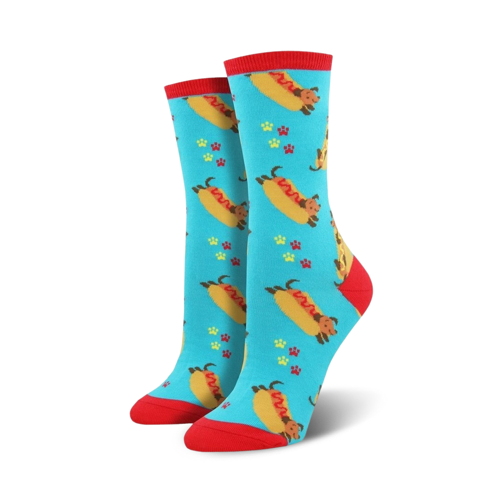 Do you love Dachshunds? Or just enjoy a nice juicy hot dog loaded with toppings? Well, either way, these adorable wiener socks are sure to please! Each awesome pair of women's novelty crew socks have cute Dachsunds sandwiched between hot dog buns printed all over against a light blue background. The cuffs, heels, and toe lines are red.