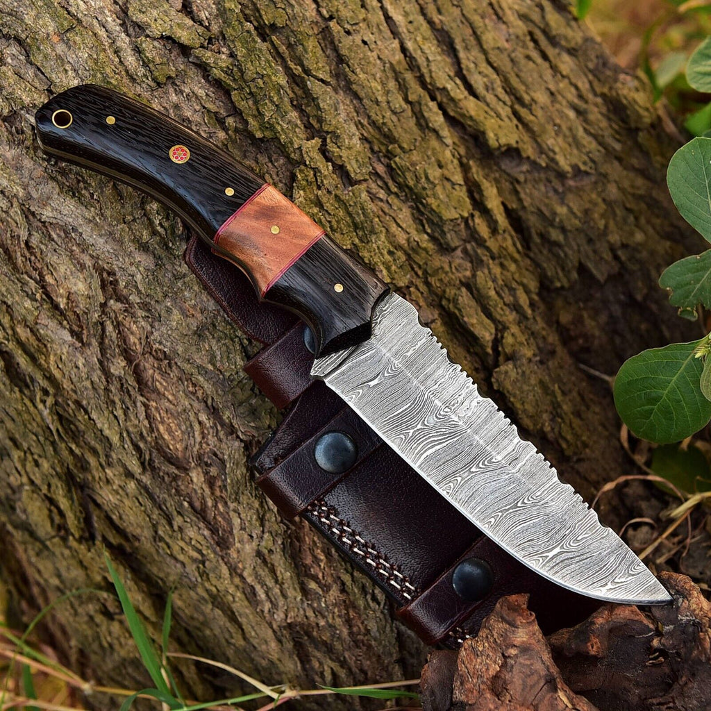 Whether you're tracking game or exploring the wilderness, our Hunting Knife with Twist Damascus steel blade and Wenge Wood/Olivewood handle is a reliable tool you can trust. Experience the perfect blend of functionality, durability, and elegance for your outdoor adventures.