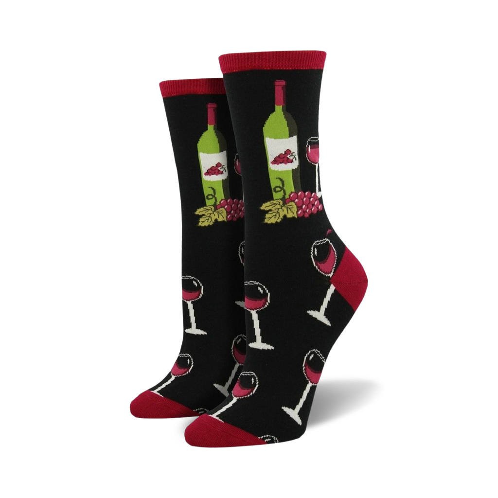 We are all known to make some pour decisions every now and then. We just hope your glass is big enough! These cool novelty socks will have you celebrating wine-o'clock every hour. Each fun pair of black and burgundy crew socks features full wine glasses printed all over and a wine bottle and a bunch of grapes above the ankle.