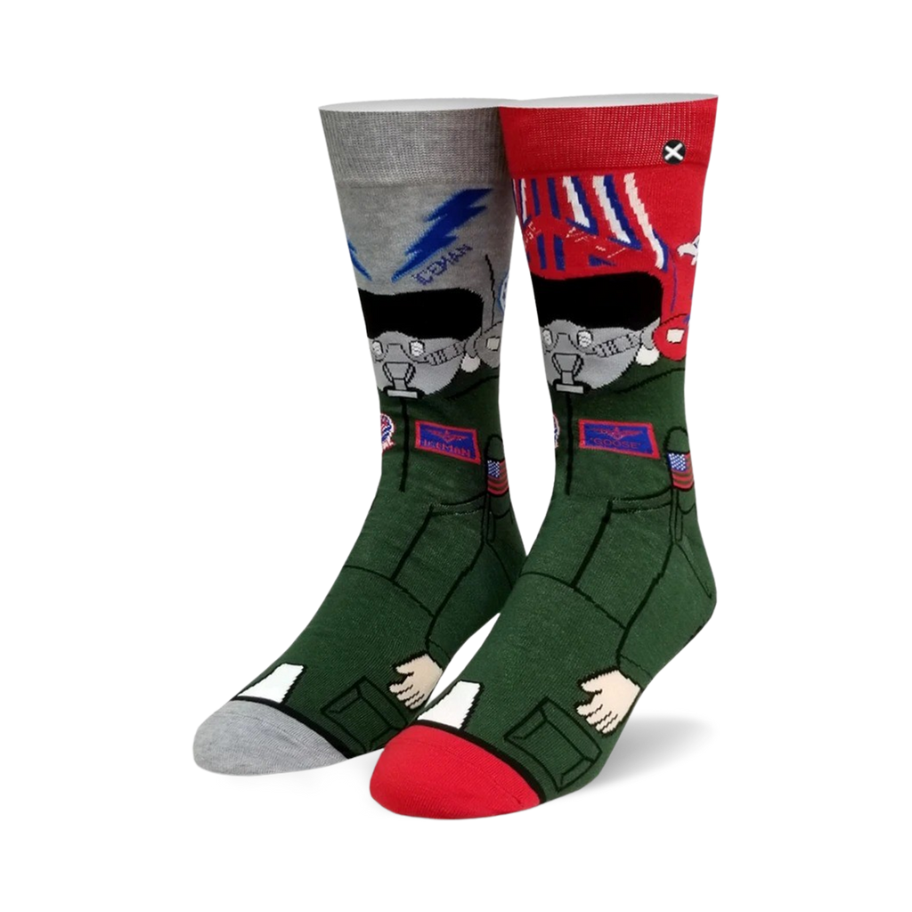 Need a wingman? These socks have you covered. They're crew socks showing a cartoon pilot in a green flight suit. One sock's top is grey with lightning bolts, the other is red with stripes. The visible parts of the design are fun and detailed- check out the little patches on the sleeves! The sock's toes and heels are a contrasting solid color - one red, one grey. Perfect for showing off your sense of humor, these are sure to be a conversation starter.