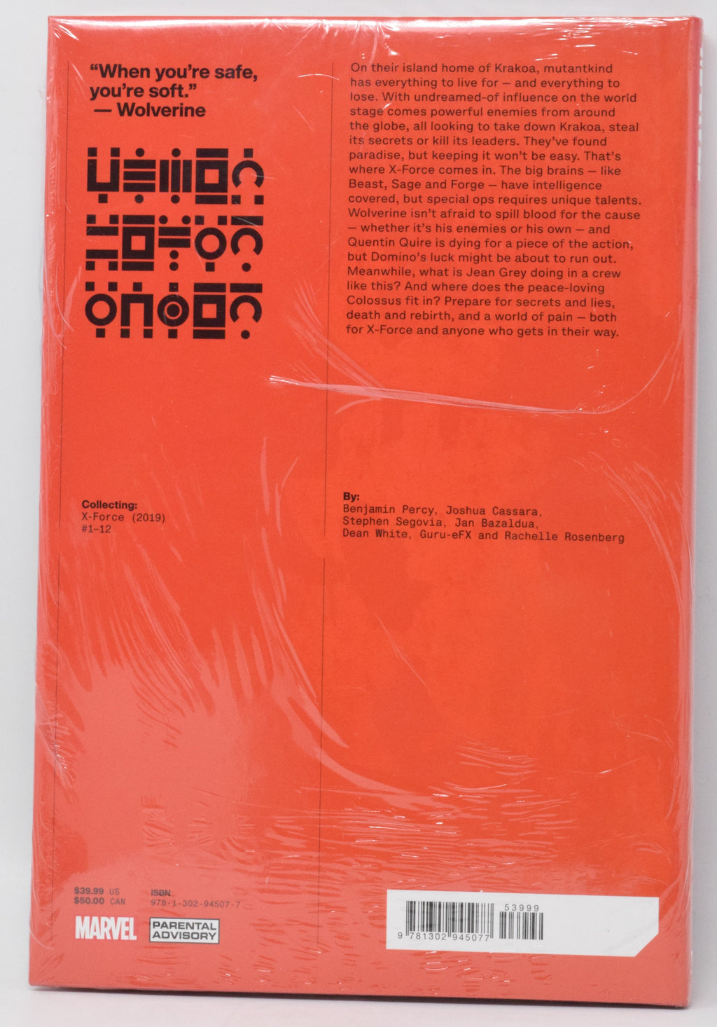 The high price of a new dawn! The X-Men have an island home and a bright future at last - but the dangers that mutants face are far from over! That means they need X-Force, the mutant CIA - half intelligence branch, half special ops. Beast, Jean Grey and Sage are on one side; Wolverine, Kid Omega and Domino are on the other. The all-new X-Force must hit the ground running, investigating a shocking murder and taking on global threats targeting mutantkind - but their deadly choices will have dark consequences. When new technology threatens Krakoa's safety, Beast takes matters into his own hands! Domino's luck is changing...for the worse! And in the heart of South America, X-Force finds a growing problem that threatens to destroy everything they've built - and one of their own might be responsible! Collecting X-FORCE (2019) #1-12.