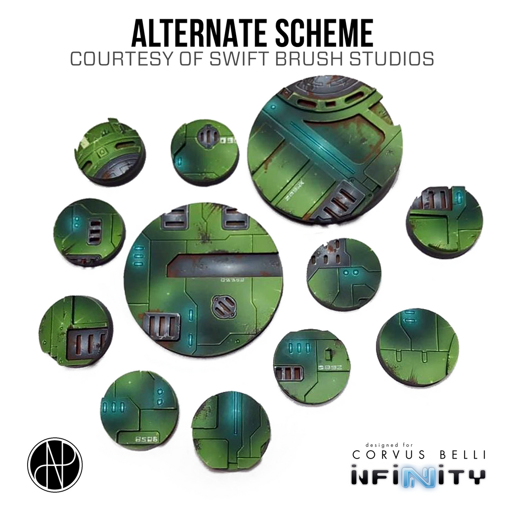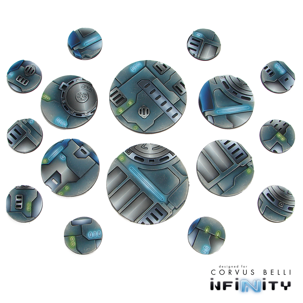 The bases can be mounted on standard Corvus Belli bases that you can magnetize for transport using our Rare Earth Magnets. They are lined up to work perfectly with our Infinity Status Discs.