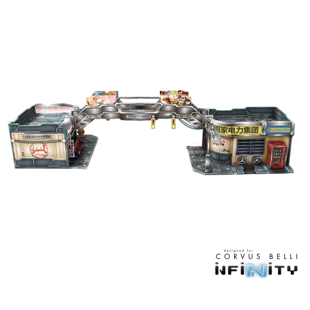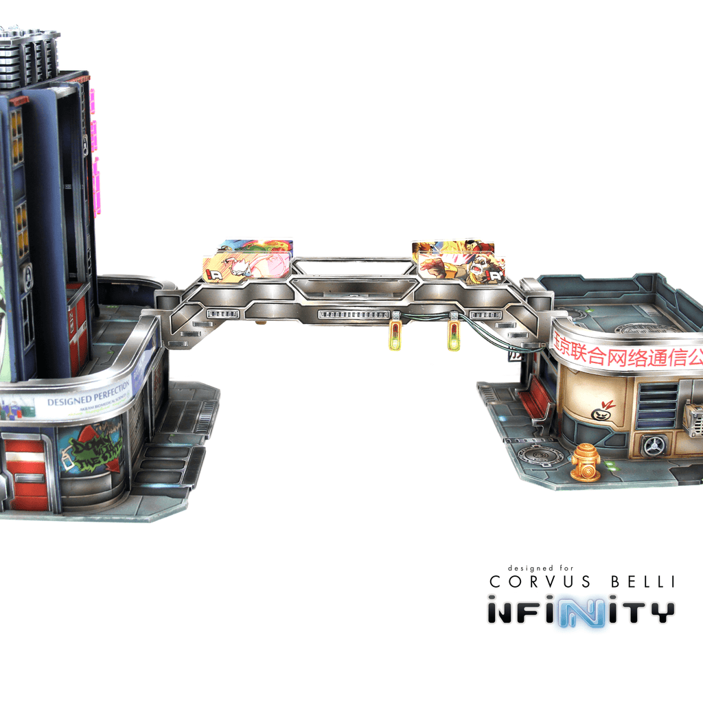 The Xǐguǎn Bridge is a Yu Jing-themed urban terrain designed for Infinity the Game. This MDF and Acrylic building kit is perfect for any 25-35mm scale sci-fi settings and this pack includes one bridge that attach to the Tower building as well as the Corner buildings. The building photos are only included for reference and are not included with this product.