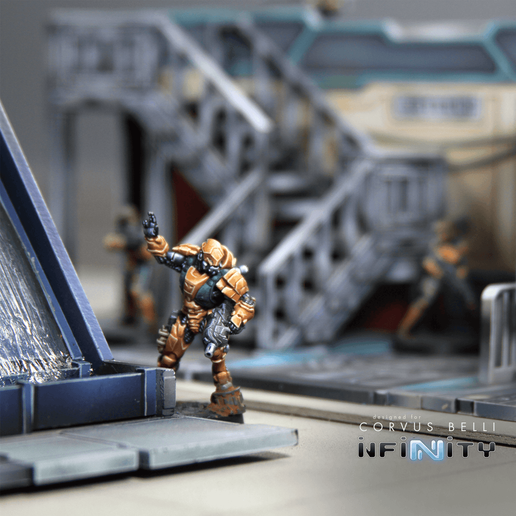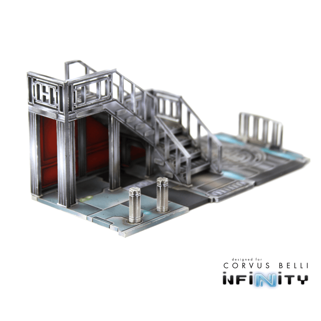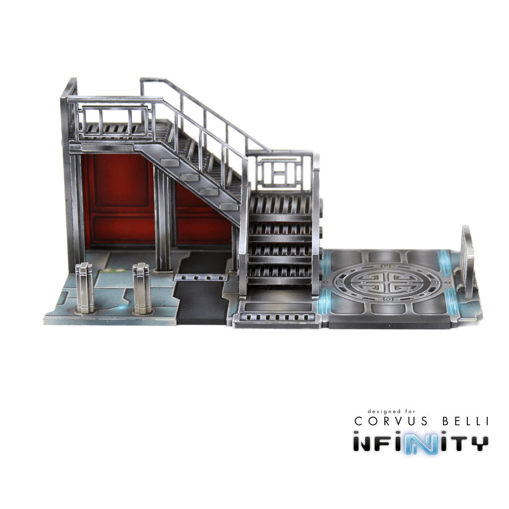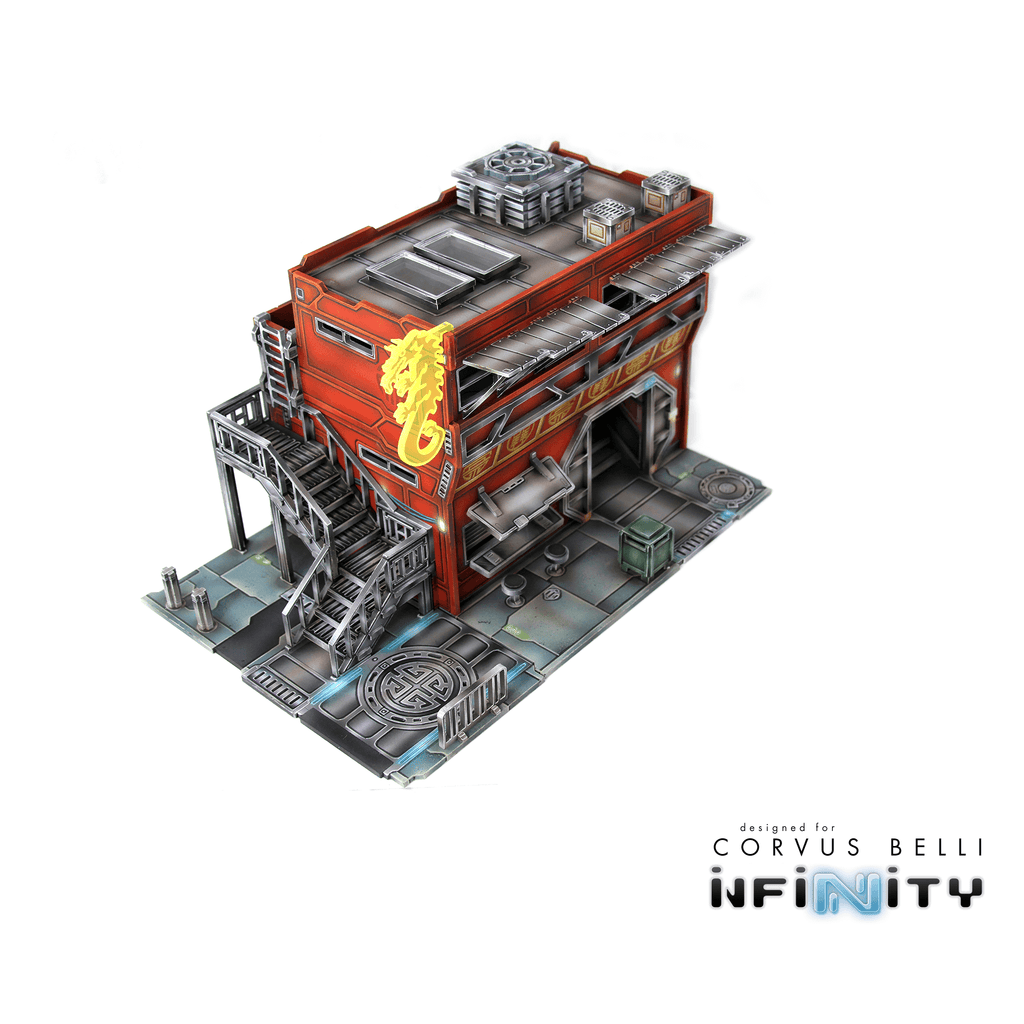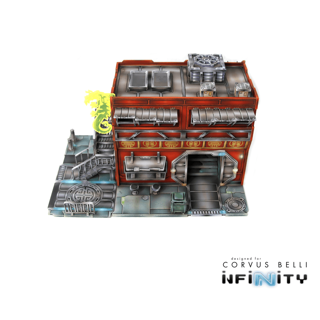 The Xǐguǎn Office Stairs is medium-sized Yu Jing-themed urban terrain designed for Infinity the Game. This MDF and Acrylic building kit is perfect for any 25-35mm scale sci-fi settings and this pack includes one set of stairs that attach to the Office building as well as the Corner buildings. The building photos are only included for reference and are not included with this product.