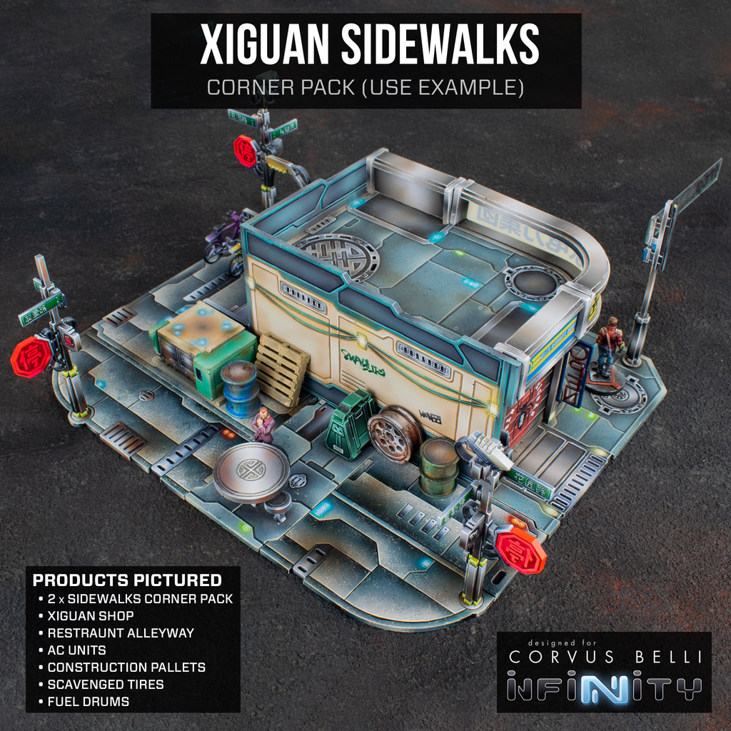 Xiguan is Yu Jing-themed urban terrain designed for Infinity the Game. The buildings, sidewalks, alleyways, and back alleys are designed to interlock in interesting ways to create any density of future urban sprawl that you can imagine.