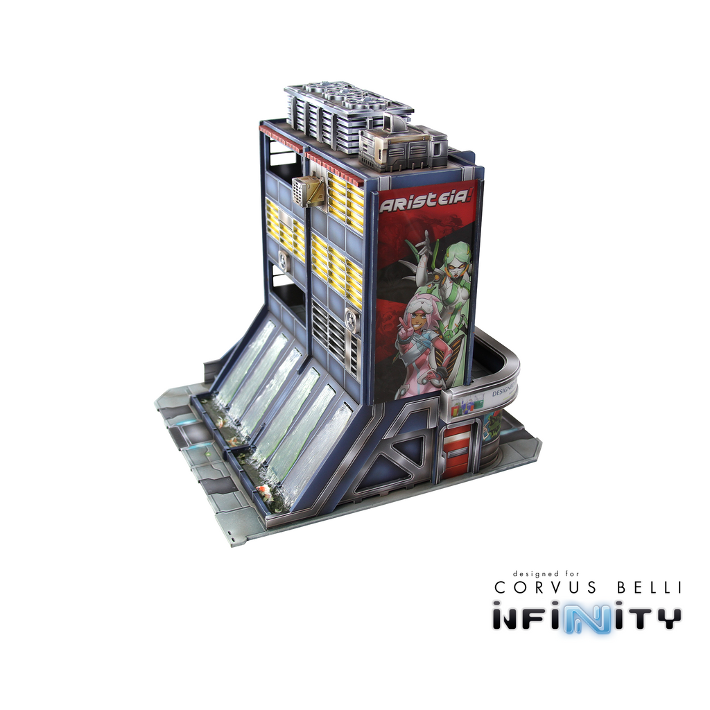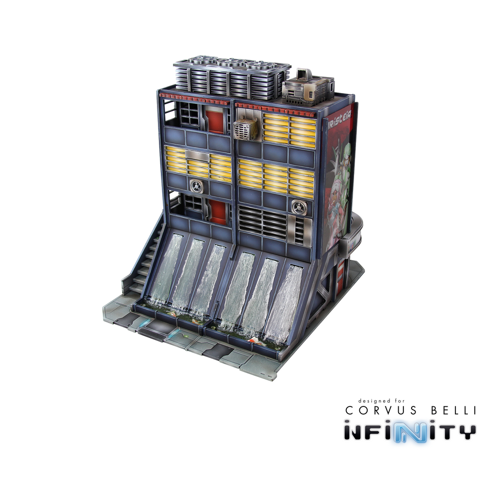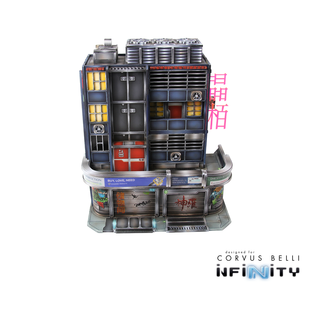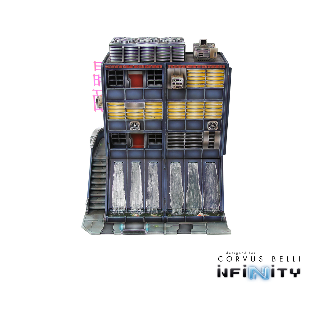 The Xǐguǎn Tower is a large Yu Jing-themed urban terrain piece designed for Infinity the Game. This MDF and Acrylic building kit is perfect for any 25-35mm scale sci-fi settings and this pack includes one large building.