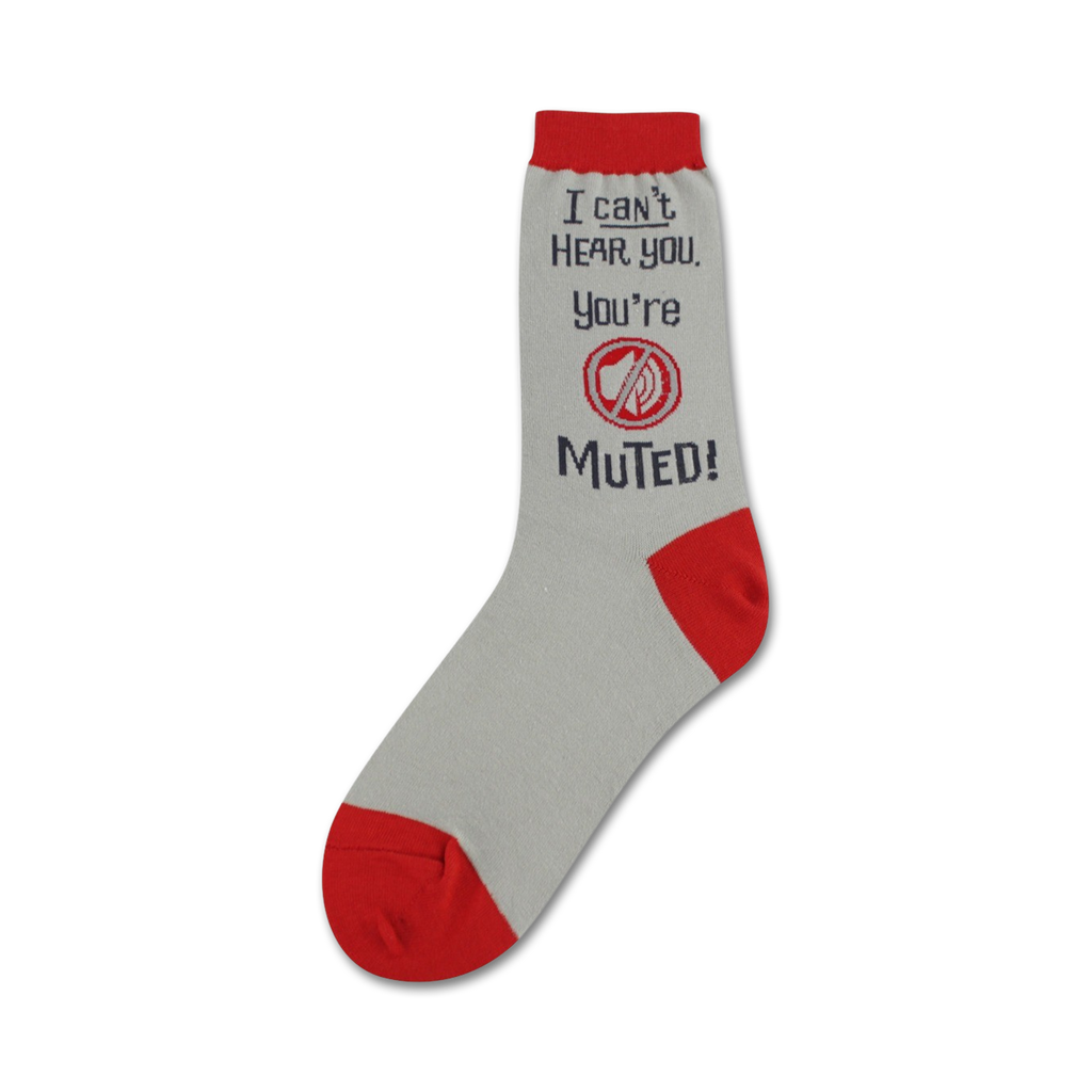 Think you've heard all the sock jokes? Think again! These "You're Muted" novelty socks will get a laugh from anyone who can hear you coming from a mile away. We're talking sassy socks for women. They're grey with red toes and heels, and have red text that says "I Can't Hear You. You're muted!" with a red circle and a line through it. In this age of video conferencing and virtual meetings, these socks are the perfect way to make a statement digitally.