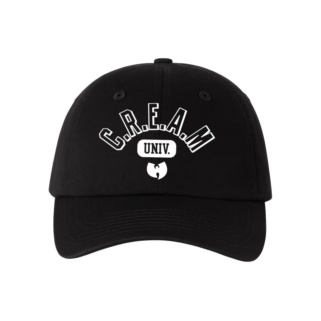 Classic black dad hat with the C.R.E.A.M. University logo embroidered on the front. Adjustable youth fit for everyday wear.